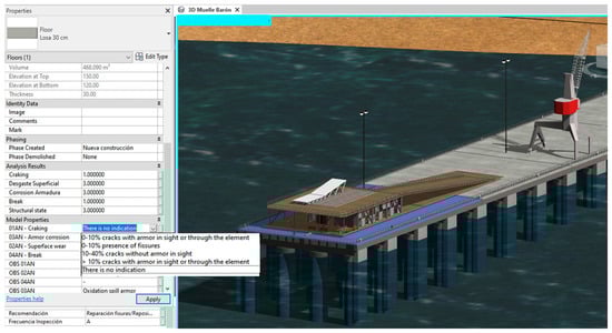 The proposed methodology was implemented in port infrastructure, particularly a penetration dock where a large number of the elements that make up the dock are immersed in seawater and are affected by salinity and the marine environment, developing various pathologies which must be controlled to avoid progressive deterioration of the infrastructure. The structural state of the elements was obtained from visual inspection, and the categorization of structural damage along with these maintenance activities was defined according to material, information that can be easily accessed in the digital model and in the MS Excel spreadsheets. Through visual programming, it was possible to generate a two-way flow of automatic import and export of information, which allows for the digital model to be kept up to date and with a clear visualization of the structural state of each element and its maintenance activities, presenting the possibility of handling this tool from the MS Excel spreadsheets or from the same model generated in Autodesk Revit. The tool developed proves to be very useful for optimizing maintenance activities and keeping an up-to-date record of the activities carried out. To determine the structural condition of the infrastructure in greater detail, it is advisable to supplement the results obtained in visual inspection with laboratory or in situ tests, whether destructive or nondestructive. Among the applicable tests are the compressive strength test, the strength of the reinforcements, and carbonation, among others. In this way, it will be possible to know the current state of the elements and define maintenance actions that complement those already established, generating a complete maintenance plan that addresses the current deficiencies of the elements of the infrastructure.