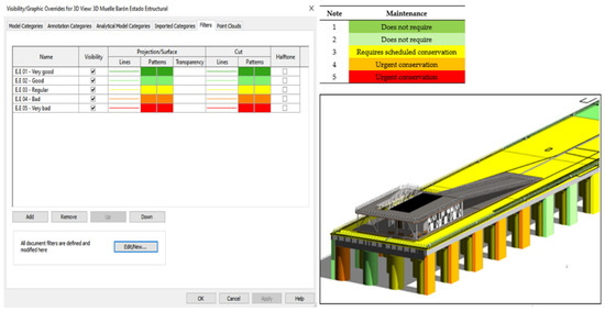 To facilitate the visualization of the structural state of the elements of the infrastructure, graphic visibility filters were created in Autodesk® Revit® according to the structural state of the element to determine the need and urgency of maintenance of each element. In this way, it is possible to visualize the infrastructure with the corresponding colours, which vary according to the information record after each inspection (Figure 19).