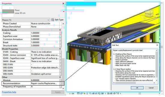 Additionally, two parameters have been created for all elements of the Autodesk® Revit®, the infrastructure, one of which indicates the frequency of inspection of the element and, another, the recommended maintenance activities that must be validated and/or supplemented by the engineer in charge of the inspection. Therefore, the performance of the recommended maintenance activities will be conditioned by the rating of the particular item. Figure 20 shows an example of a slab cloth in which, in addition to the structural state properties, it is possible to visualize that an annual inspection, represented with the letter A, should be carried out, as well as the recommended maintenance activities. Since this element has a regular structural state, the indicated maintenance activities do not require more urgency so that they can be programmed.