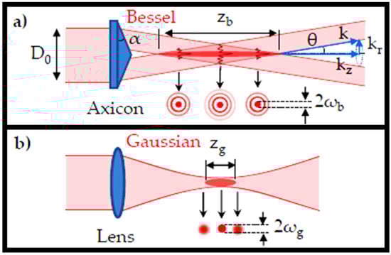 The BB provides a considerably extended (typically one order of magnitude longer) depth of focus (DOF) than the Gaussian equivalent with a comparable beam diameter (2ωg~2ωb) than the normal GB, which is delivered by a focusing lens, as shown in Figure 1b [12]. The elongation of DOF (zg = 2 × Rayleigh range) in the Gaussian configuration will necessitate lenses with extended focal lengths and incident beams with narrow beam diameters. This traditional design has a wide range of applications and, unwantedly, produces a focused beam with a wide beam diameter, which limits uses for managing small features. In this case, the Bessel arrangement might provide a large DOF while keeping the beam diameter small.