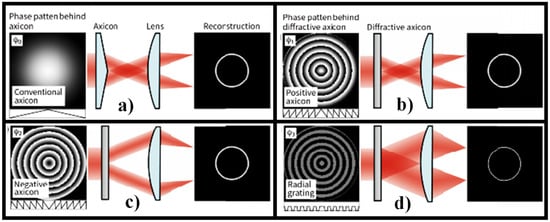Optical setups for generating a RSB are seen in Figure 3. To rebuild the beam, an axicon is typically used as seen in Figure 3a [62]. Figure 3b shows a diffractive axicon that is more compact. A BB with a longitudinal axial beam is also obtained between the diffractive axicon and a lens in this solution [62]. Since the lens may be affected by irradiation of the BB in the unlikely event of a high-power laser, the BB is unsuitable for some applications. Designing a negative diffractive axicon, as seen in Figure 3c, is one way to prevent such harm [62]. The lens is not damaged in this case; however, the RSB’s width is technically double that of the diffraction limit, since the maximum NA of the diffraction light is half that of standard focusing with a lens. For certain applications, the resulting reduction in resolution may be an issue. The setups in Figure 3a,b have the same problem. A radial grating is used to solve this problem, as shown in Figure 3d [62].