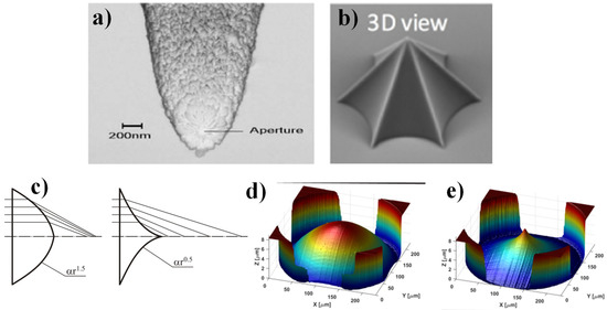 Note that narrow axicons [73] with a small opening angle (about 20°, Figure 4a) are used as tapered fiber probes in scanning near-field optical microscopes (SNOMs) and can detect evanescent radiation [69,74,75], and also may be used as sensors of the longitudinal component of the electric field [76,77]. Lately, some adjustments of the classical conical axicon have been well thought out: gradient index axicons [78,79], axicons coupled with a spiral phase plate (SPP) [80,81] as well as logarithmic axicons [82,83], axicons with non-linear profiles [84,85] andwrinkled [86] (See Figure 4). Such structures, as a rule, combine several functions: not only the generation of Bessel-like beams, but also the introduction of a vortex phase, the formation of a uniform or spiral intensity, a decrease in the size of a light spot, and an increase in the resolution.