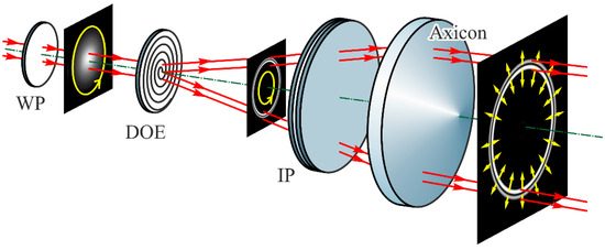 Optical scheme for converting a circularly polarized beam into a radially polarized vortex laser beam: a diffractive optical element (DOE) in the form of a binary phase axicon generates a conic wave with a defined divergence angle, an interference polarizer (IP) converts circular polarization into cylindrical polarization (radial or azimuthal in dependence of the conic divergence angle), and the refractive axicon (Axicon) transforms the conic wavefront into the plane wavefront [120].