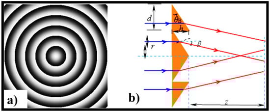 Tunable axicons have been realized using several methods. The axilens, which incorporates the characteristics of an axicon and a spherical lens, was created using CGH optical components [103]. To obtain lensacons, a method established on a liquid crystal and phase-shifted electrical signals was suggested, with the logarithmic axicon as a model [48]. Some researchers used CGHs to create an arbitrary-order BB sequence that was nearly diffraction-free [58,142]. Since the perfect real axicon can produce nondiffracting BBs, fabrication errors can have an impact on the efficiency of NDBs. As a result, an easy-to-use approach is proposed. To attain phase modulation of the incident beam, the process involves loading the CGHs into the SLM. Figure 8a shows the hologram for mimicking the positive axicon, while Figure 8b shows the hologram’s central profile [143]. The profile can be seen as an arrangement of evenly spaced grooves, where d and h are the period and height of the grooves, respectively.