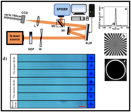 Using a single reflective SLM, a simple but effective approach for producing zeroth- and first-order GBBs [146]. Diffraction half-angles of less than 40 μrad are obtained, and the propagation distance of the beam of more than 1.5 m is attained. In Figure 9, the experimental configuration is shown in the upper panel. To avoid damaging the SLM, the beam from a high-power few-cycle fs laser system is first controllably attenuated by a neutral density filter (NDF). The beam is then passed through a pair of fused silica wedges for accurate modification of the system’s minimum pulse duration. The pulses are characterized by spectral phase interferometry for direct electric-field reconstruction using a commercial device. Figure 9a shows an example of a normal pulse (duration 7.5 fs) [146]. Following the wedges, the beam enters the first half of the SLM, which has been programmed with the phase distribution of a highly charged optical vortex, as seen in Figure 9b [146]. The beam’s phase and amplitude are modulated, and the beam is diverted to M1, a clear silver mirror. The beam is reflected a second time at the other half of the correctly programmed SLM through this mirror. The topological charge of the highly charged optical vortices formed from the first reflection is reset to zero or one after this second reflection. Figure 9c depicts a standard RSB in the plane of the lens [146]. Due to their diffraction resistance, BBs are useful in high aspect-ratio micro-hole drilling. However, traditional BB generation approaches result in low adjustability of the nondiffraction length. The use of a phase-only SLM to generate Bessel-like beams (BLBs) with an arbitrary nondiffraction length is demonstrated [116]. Nondiffraction lengths ranging from 10 to 35 mm can be obtained using this process by altering the designed phase profile. The drilling results are shown in Figure 9d [116]. By spatially forming a fs laser beam, high-quality, high aspect ratio (560:1), and length-adjustable micro-holes can be drilled [116].