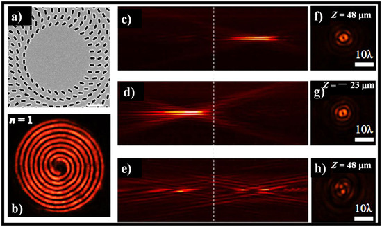 One attractive possible application of MSs is the formulation of a meta-axicon based on these properties [186]. Recently, these properties were used to demonstrate a variable meta-axicon made up of rectangular nano-apertures assembled in numerous concentric rings that can focus left circularly polarized (LCP) light into a real BB and defocus right circularly polarized (RCP) light into a virtual beam [41]. By regulating the orientations of the nano-apertures, the desired phase discontinuity in cross-polarized transmitted light is added along with the interface. Furthermore, by properly designing the phase profile along the surface, meta-axicons can produce BBs of arbitrary orders. The meta-axicons have broadband optical properties, allowing them to change the wavelength of incident light from 690 nm to 1050 nm [41]. The SEM image of the meta-axicon is shown in Figure 10a. The intensity profiles along the propagating directions and cross-sections are shown in Figure 10b–h.