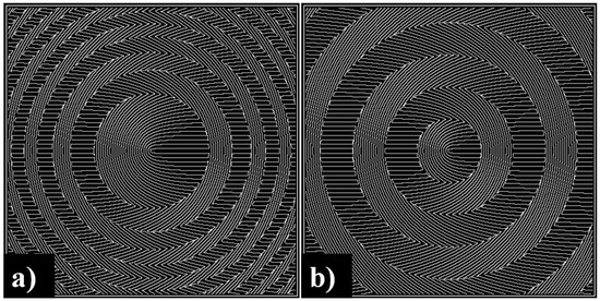 The chief drawback of subwavelength gratings is the nonuniformity of the Fresnel reflection coefficient that arises because of the nonuniformity of a crystal’s refractive indices. However, this shortcoming can be evaded by joining subwavelength polarization gratings with a binary focusing element (See Figure 11), for example, zone plate or binary axicon [197,198,199,200]. In this case, the focusing element creates an additional phase, which is realized by rotations of the subwavelength grating grooves. A phase incursion of π radians corresponds to a rotation of the grooves by 90 degrees (Figure 11), and then all areas of the optical element will transmit radiation approximately uniformly.