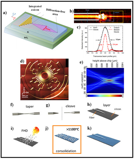 In [175], the self-assembly of an embedded micometer-scale oblate axicon refractive lens is reported. This falls under the category of “micro-axicon”, a subset of axicons that has sparked interest thanks to lens demonstrations on planar [211], fiber [212,213,214], and bulk materials [215]. The created lens resembles an oblate axicon, which when launched produces a quasi-BB that is guided in the substrate’s planar optical layer. The manufacturing process uses consolidated high-purity glass soot to monolithically mount an optical fiber to an optical planar substrate. The soot is deposited using flame hydrolysis deposition (FHD), which uses mass flow controllers to adjust the refractive index, stress, and thickness of the subsequent glass. The embedded optical fiber (IOF) network [216] has shown environmental reliability [217], physical monitoring [218], and refractometry [219] so far. Figure 12f–k demonstrates the fabrication process of IOF. For a detailed study, consult [175].