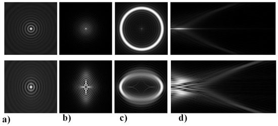 Axicon-lens doublets realize the Fourier transformation of BBs [121] are used to generate a light ring with the radius independent on vortex phase singularity (See Figure 7), named as the “perfect” optical vortices (POV) [122,123]. Such beams are used for optical capture and manipulation of microparticles [124], for free-space-optical communication [125,126], for high-resolution plasmonic structured illumination microscopy [127] in the study of noncollinear interaction of photons having orbital angular momentum (OAM) in the spontaneous parametric down-conversion process [128], as well as for the generation and detection of optical vortices outside the focal plane [129]. In the vector case, or when high-aperture optical elements are used (for example, a toroidal lens [130,131] may be used instead of an axicon-lens doublet), additional effects arise associated with both polarization transformations and redistribution of the 3D structure of the field intensity [132,133,134,135,136,137,138].