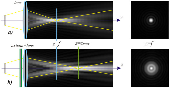 Interesting and unusual properties are also provided by combining the two classic elements—the axicon and the lens. Typically, axicon-lens doublets (or lensacons) are investigated in the scalar paraxial approximation [103,104,105] and applied to vary the depth and lateral size of the focal area [106]. These properties of the lensacons are used in various optical systems [47,107,108,109] including medicine [110,111,112] as well as for laser structuring and micromachining [113,114,115,116,117]. In addition, lens-axicon combinations are used to control the polarization conversion of the beam in an anisotropic crystal [118,119] or multilayer anisotropic film (See Figure 6) [120].