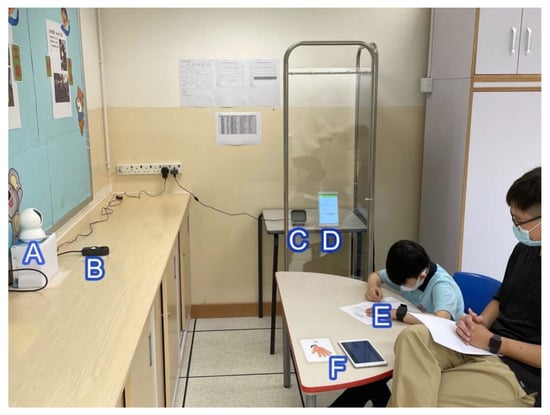 The SEN classroom serving as the context of our student-centered learning environment where IoT-enhanced ABA was delivered. (A) Camera; (B) Light Sensor; (C) CO2/Humidity/Temperature Sensor; (D) Emotion Recognizer; (E) E4 wristband; (F) mobile client of the 3i-Learning System.