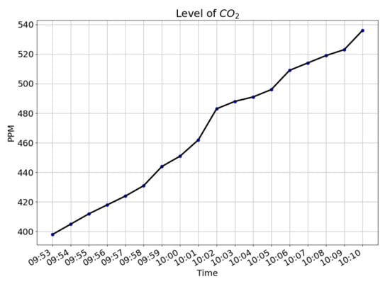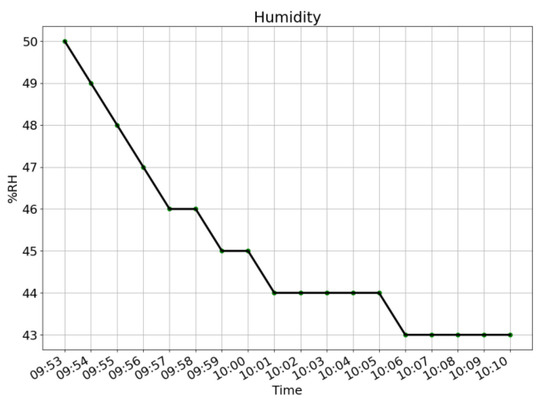 Figure 6, Figure 7 and Figure 8 give the plots of CO2 level, humidity, and temperature along the timeline of a single typical training session. For the level of CO2, a steadily increasing trend is shown. For both humidity and temperature, steadily decreasing trends are shown.