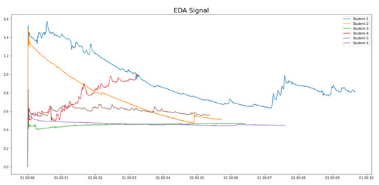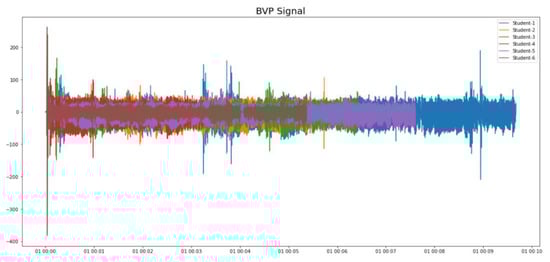 We collected physiological data from 15 SEN students (all having ASD and moderate intellectual disabilities). A diverse range of the students’ physiological data was found. For example, the BVP signals and the EDA signals of six of the students are shown in Figure 9 and Figure 10, respectively. It is clear that the physiological data are highly personalized. Therefore, single-subject research [35] (which is a common research practice in SEN research), instead of conventional big data analytics, was suggested for data analysis.