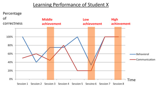 Detailed learning performance of a single student. Low, middle, and high level of achievement occurred in session 6, session 3, and session 8, respectively.