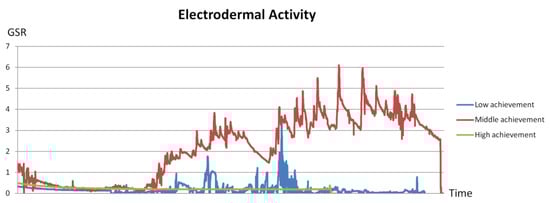 As reflected from the evidence, when the student was within the high achievement level, his/her electrodermal activity remained steady and low. Fluctuations are shown when he/she was within middle or low achievement levels. This suggests a possible relationship between the GSR and students’ performance, and requires further investigation.