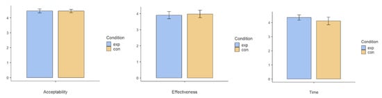 Comparison of participating teachers’ acceptance of the system in terms of (1) acceptability, (2) effectiveness, and (3) time of effect. No significant difference was found between the experimental and control conditions.