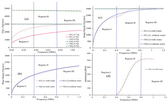 Regime-I: 0–400 kHz where the attenuation is very small due to the absence of leakage into the fluid. In this regime, the phase velocity of the guided wave is below the fluid velocity.