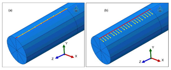 The FEM analysis was carried out to find an optimal angle of excitation for simultaneously transmitting and receiving at least two fundamental guided wave (GW) modes (L(0,1) and/or T(0,1) and/or F(1,1)) and to study their mode behavior in straight waveguide configuration when embedded in air and inviscid fluid (de-ionized water) at different immersion rates. The FEM and waveguide parameters are shown in Table 1. Figure 2a shows the snapshot of the FEM model with a cylindrical waveguide with an input signal displacement at the surface of the waveguide oriented along the waveguide axis and Figure 2b shows the input loading perpendicular to the waveguide axis.