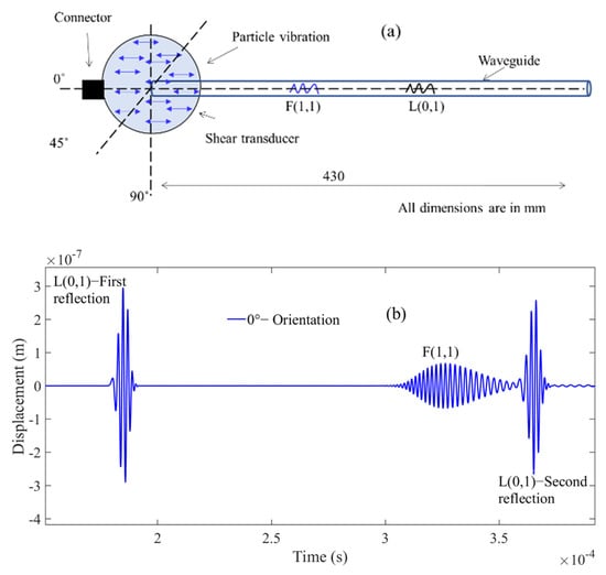 (a) Shows the shear transducer orientation (0°) to the waveguide axis (b) and the reflected A-Scan signals from FEM simulations with L(0,1) and F(1,1).