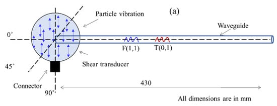 This configuration is schematically shown in Figure 3a which shows the shear transducer with three possible surface traction configurations (0°, 45°, and 90° w.r.t axis of the cylindrical waveguide). Figure 3a shows the A-Scan signals of a straight waveguide with an input signal displacement at the surface of the waveguide oriented along the waveguide axis (0°). Figure 4a presents the angle of excitation perpendicular to the axis of the waveguide (90°).