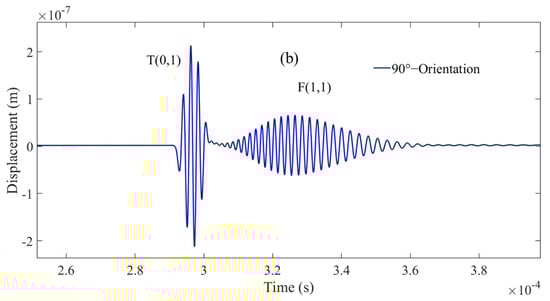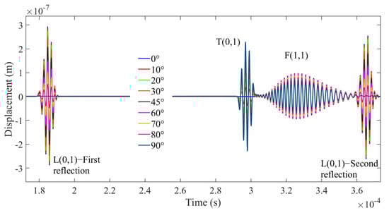 Figure 3b and Figure 4b show that at least two wave modes are simultaneously excited/received L(0,1) and F(1,1) at 0° configuration and T(0,1) and F(1,1) at 90°. In addition, FEM studies have also been conducted at a different angle of excitation from 0° to 90° to find the optimum angle to achieve the maximum displacement of the F(1,1) mode. The obtained A-Scan signals are shown in Figure 5, it was observed that the 45° excitation provides the maximum displacement of the F(1,1) mode and 0° configuration for L(0,1) and 90° for T(0,1), respectively.