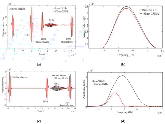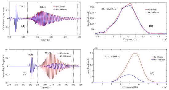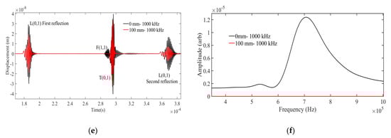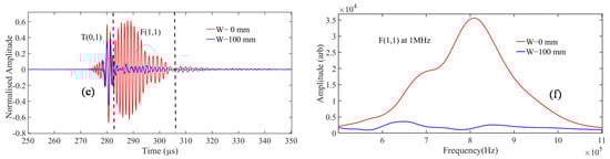 Subsequently, using time gates, the F(1,1) modes were evaluated in the time domain and their frequency spectrums were plotted and shown in Figure 8b,d,f. From the experimental results, the following observations were made of the F(1,1) mode: