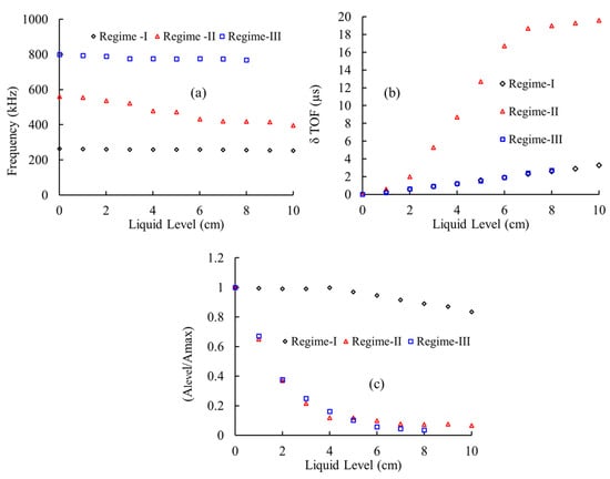 The response of F(1,1) at each level of immersion are shown in Figure 9. It was observed that at 250 kHz (Regime-I), the TOF shift was found to be optimum for level sensing, whereas in 500 kHz (Regime-II), both the change in TOF and peak frequency shift were found to be higher. Finally, at Regime-III (1000 kHz), the drop in amplitude and the change in TOF were found to be optimal for level measurement.