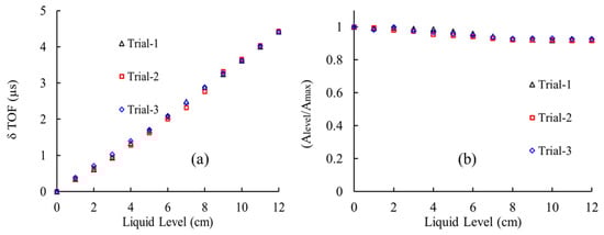 The level measurement experiments were repeated using a 1mm waveguide (SS-308L) with an operating frequency of 250 kHz (Regime-I) for multiple trials to validate the repeatability of this technique. The range of measurement was fixed at 12 cm and the results were obtained at each level of immersion. From the earlier results, it was observed that the change in time of flight (δTOF) and drop in amplitude was found to be dominant in Regime-I; hence, the response of F(1,1) at each level of immersion are monitored and shown in Figure 10. From Figure 10, it is evident that the data was found to be consistent and confirmed to be repeatable with an error percentage less than 2.5%. The obtained results follow the same pattern of the previous results reported in Figure 9. Combined with a calibrated curve of the δTOF against the liquid level, it will be possible for monitoring the rapid changes in fluid level with more precision and accuracy.