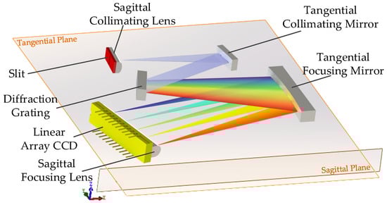 In many spectrometer configurations, tangential image plane and sagittal image plane vary in positions, resulting in astigmatism [14,15]. The astigmatism is inherent in a spectrometer and cannot be corrected by the spherical mirrors themselves. In most cases, the Czerny–Turner spectrometer has the best structure because its structure and adjustment are simple, and its resolution can be improved and the astigmatism can be compensated by modifying the optical system. The various methods to correct astigmatism in Czerny–Turner spectrometers have been investigated, such as using a toroidal lens [16], using an off-the-shelf cylindrical lens [17] and freeform surface [5,7]. As a precursor to the content of this paper, Wu et al. showed how to eliminate astigmatism [18,19]. Unlike conventional Czerny–Turner spectrometers, the spherical collimating mirror was replaced by two cylindrical mirrors. The equations of positions are constructed by adjusting the distance between two cylindrical mirrors so that astigmatism was eliminated. Compared with the conventional Czerny–Turner spectrometers, astigmatism was well corrected and the root-mean-square (RMS) spot radius is reduced to less than 18 μm.