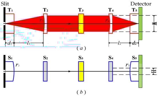 In an optical system a tangential plane and a sagittal plane can be identified. Coddington’s equations are an excellent tool in this case. The relation between object distance (OD) and image distance (ID) can be deduced for tangential plane and sagittal plane using Coddington’s equations. Through this method, the relative position of each optical element can be directly determined, and a high-performance spectrometer can be designed. The theoretical schematic diagrams of UTCT in tangential plane and sagittal plane are shown in Figure 2. T or S represents the optical surface of tangential plane or sagittal plane and the number of the subscript represents the sequence number of the optical plane. T1(S1) represents the convex surface of the sagittal collimating cylindrical lens. T2(S2) represents the reflective surface of the tangential collimating mirror. T3(S3) represents the working surface of the planar diffraction grating. T4(S4) represents the reflective surface of the tangential focusing mirror. T5(S5) represents the convex surface of the sagittal focusing cylindrical lens. r represents the curvature radius of optical surface and d1 and d2 represent the center thickness of the lens. l1 is the distance between T1(S1) and T2(S2) while l2 is the distance between T4(S4) and T5(S5).