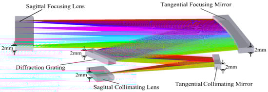 where and are sagittal image distance and tangential image distance, respectively, d1 is the thickness of sagittal collimating lens. The derivation refers to the principal ray in sagittal plane and the principal ray hits on the cylindrical lens vertically. Therefore, the incidence angle of the convex surface (S1) is 0. It is easy to realize that the lens acts as a plano-convex lens in the sagittal plane and acts as a parallel plate in the tangential plane, as the object distance, and are actually equal, and the numerical value is the thickness of the sagittal collimating lens. The slit is placed at the focus point of sagittal collimating lens and tangential collimating mirror so that the collimated beams can be obtained.