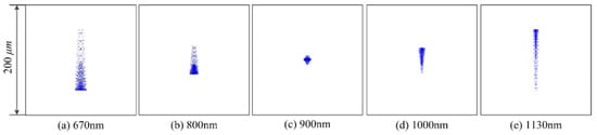 The spot diagram is one of the main evaluation indexes. The performance of UTCT can be evaluated by analyzing the size of spot diagrams. The spot diagrams of several specific wavelengths are shown in Figure 4. It shows that the imaging effect of the center wavelength is excellent as well as the imaging size of the edge wavelength on both sides is kept within 200 μm. As mentioned in Section 3, the height of a pixel is 200 μm. The results show that all of the light beam can be collected by the detector, demonstrating that UTCT is with high throughput.