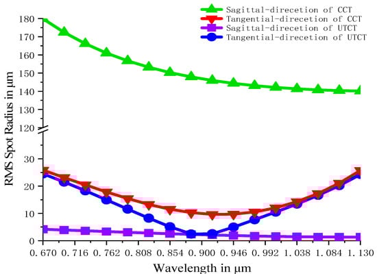 In Figure 5, we associate RMS spot radius with wavelengths to evaluate and analyze the effect of energy concentration. Obviously, the RMS spot radius is reduced to less than 25 μm in the wavelength range 670 nm–1130 nm in tangential plane and the RMS spot radius is less than 5 μm in the sagittal plane as shown. From the contrast of the RMS spot radius between UTCT and CCT in Figure 5, the effect of astigmatism on energy loss is almost eliminated. The results demonstrate that the energy collected by the detector of UTCT will be more concentrated while the resolution remains the same level as CCT. What is more, the thickness of UTCT is obviously get thinner.