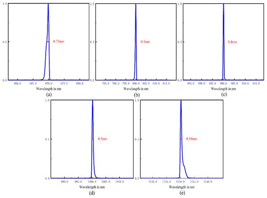 The full width at half maximum (FWHM) is used to characterize the spectral resolution of ultrathin spectrometer. In Figure 6, we calculate the FWHM of five typical wavelengths after convolution, and the results show that the resolution of the whole band is within 0.75 nm, and the resolution of the central wavelength is even reach 0.4 nm.
