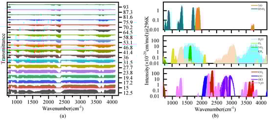 After about seven months of the in-orbit test, AIUS have been continuously providing measurements [12]. Figure 1a shows AIUS spectra observed on 20 December 2019, where the horizontal axis is the wavenumber, and the vertical axis is the transmittance at different altitudes. In the 750–4100 cm range, many components have characteristic absorption lines. Figure 1b shows the absorption line distribution of some trace gases (CO, CO, HCl, NO, HO, O, NO, CH, NO, and HNO) in the 750–4100 cm range. CO, CO, and NO have strong absorption lines, and the absorption intensity can reach up to 3.5 × 10−18 cm/mol.