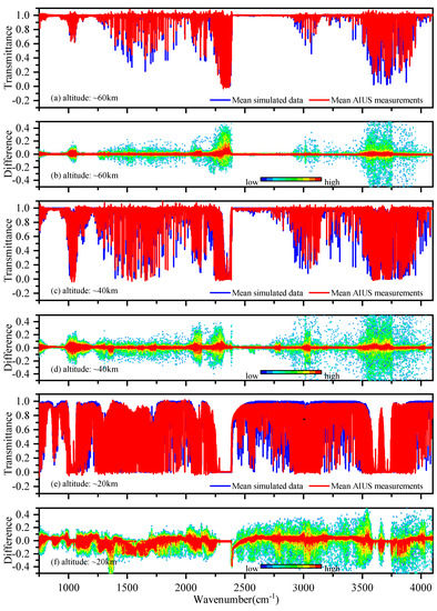 Figure 2 shows an overview of the transmittance differences between the AIUS observed data and simulated data in the spectral region of 750–4100 cm for 60–65 S in June 2019. Thirty-two pairs of measurements and simulations were averaged at three altitudes (20 km, 40 km, and 60 km). In general, the differences at lower altitudes were larger than those at higher altitudes. This suggests that the differences were related to the increased pressure and pressure broadening at lower altitudes. Figure 2a,c,e shows the mean transmittance of observed data in the red line and that of the simulated data in the blue line. It is obvious to notice that the simulated spectra are similar to the measurements. Figure 2b,d,f shows the mean differences at different altitudes, where the color represents the point density. AIUS measurements and simulations agreed with each other. Most of the differences were within ±0.1. The lower differences were found in 800–1000 cm, 1070–1250 cm, and 2400–2900 cm at 60 km, where the absorption was very weak. The larger differences can be seen in 980–1095 cm, 2250–2400 cm, 2800–3200 cm, and 3500–3750 cm. This might be due to the low signal-to-noise ratio (<200) in these spectral ranges and the uncertainties of the a priori profiles.