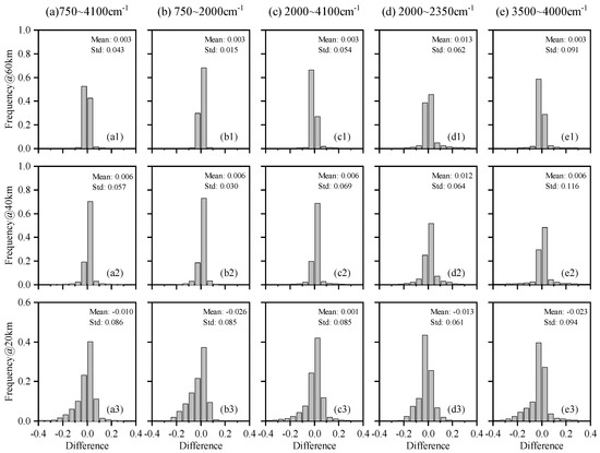 Figure 3 shows the frequency distribution histograms of the differences between AIUS measurements and simulations at three altitudes (60 km, 40 km, and 20 km) in five spectral bands. Figure 3a1–a3 shows the histograms for the full spectral band (750–4100 cm) of AIUS. There were 73% of the transmittance differences within ±0.05 at 20 km, 92% at 40 km, and 96% at 60 km. Figure 3b1–b3,c1–c3 are the histograms for the MCT and InSb bands. The histograms of the two bands were almost the same, which indicated that their detection ability was comparable. Figure 3d1–d3,e1–e3 are the histograms of two spectral bands (2000–2350 cm and 3500–4000 cm, respectively) with large transmittance differences, as shown in Figure 2. There were more than 85% of the transmittance differences within ±0.15. Therefore, the AIUS measurements agreed well with the simulations.
