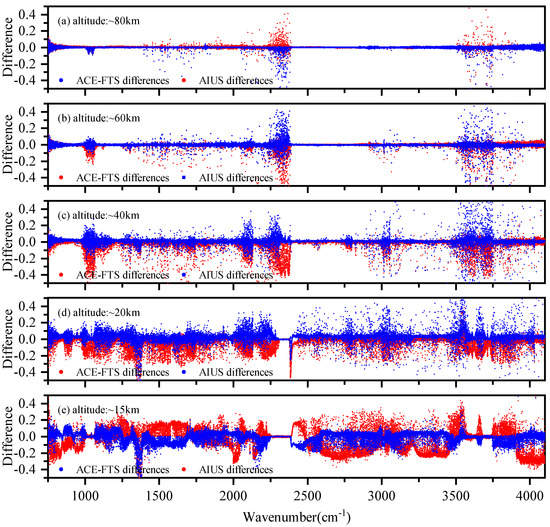 As ACE-FTS has similar instrument characteristics, a comparison between the ACE-FTS measurements and simulations was also carried out. The AIUS and ACE-FTS measurement used in the experiment were acquired on 24 May 2019 (68 S, 37 E) and on 10 May 2012 (66 S, 61 E), respectively. As the acquisition time and location of the two measurements are not identical, a direct comparison of them is not allowed. The comparison is performed using simulations as the radiative transfer medium. The differences between the AIUS/ACE-FTS data and the simulated data are demonstrated in Figure 4. Figure 4a–d shows that the transmittance differences of ACE-FTS were similar to those of AIUS at 20–80 km, which indicates the transmittance of AIUS is mostly consistent with that of ACE-FTS and can provide reliable data for scientific research. Both sensors have a larger difference in 2250–2400 cm, 2800–3200 cm, and 3500–3750 cm. The differences between AIUS/ACE-FTS measurements and simulations were probably mainly due to uncertainties of the environment and the instrument during the observations that cannot be exactly simulated. Figure 4e shows that the differences of ACE-FTS are different from those of AIUS at 15 km, which indicates there is a problem with the AIUS transmittance spectra at 15 km. This might be due to the large noise level and uncertainties of the a priori profiles at lower altitudes.