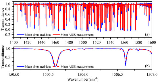 Mean transmittance of AIUS measurements and simulations in 1400–1600 cm at 40 km.