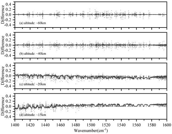 Figure 6 shows the transmittance differences between the measurements and simulations in 1400–1600 cm at 15 km, 20 km, 40 km, and 60 km, respectively. The differences vary in height and wavenumber. Figure 6a,b shows that the differences were within ±0.2 at 40 km and 60 km. Figure 6c illustrates that the differences were mostly in the range of −0.2 to 0.1 at 20 km. Figure 6d shows that the differences were in the range of −0.4 to 0.2 in 1400–1485 cm and within ±0.13 in 1485–1600 cm at 15 km. In general, the transmittance differences at higher altitudes were more discrete than at lower altitudes.