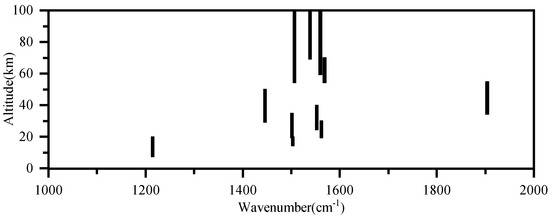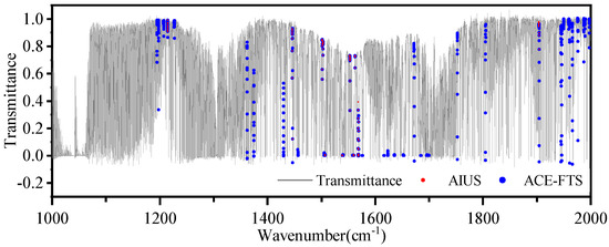 Figure 7 shows the selected micro-windows for HO retrieval at different altitudes. Eleven spectral micro-windows were selected in the 1000–2000 cm. The comparison of micro-windows between AIUS and ACE-FTS is shown in Figure 8. The solid line represents the transmittance spectra, the red dot represents the micro-window selected from AIUS, and the blue dot represents the micro-windows selected from ACE-FTS. The micro-window selected from AIUS were basically contained in those of ACE-FTS. Moreover, only 15% of the channels accounted for 75% of the information, which can improve the retrieval efficiency.