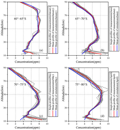 The HO retrievals of representative months (January, June, May, and April) in four latitude regions are presented in Figure 9. The dashed line represents single profile retrieved from AIUS measurements, and the red line represents mean profiles retrieved from AIUS measurements. In general, the vertical distributions of the HO mean profiles were different in different latitude zones and months, especially at the lower stratosphere and upper mesosphere. For 70–75 S and 75–80 S, the single profile distributions were more discrete than that in 60–65 S and 65–70 S, which indicated that the variance of the HO profiles can be larger.