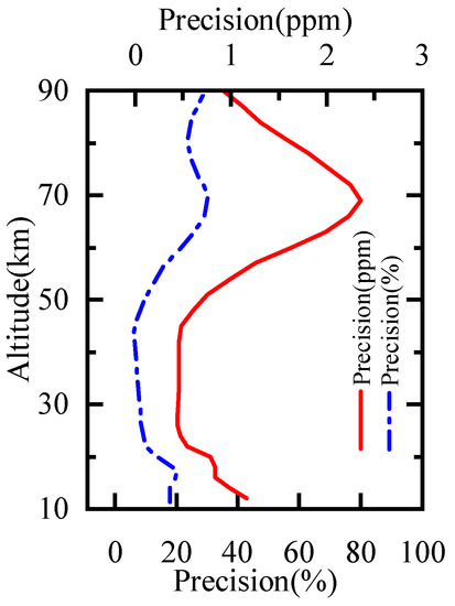 The retrieval precision was calculated from the diagonal elements of the solution covariance matrix as Equation (5) [28,29]. The precision of HO profiles for 60–65 S in January is shown in Figure 10. The red solid line represents the precision and the blue dash line represents the precision in percentage. The precision was less than 1.3 ppmv (21%) below 57km and about 0.9–2.4 ppmv (20–31%) at 60–90 km. It illustrated the precision of HO profiles is comparable to that of MLS.