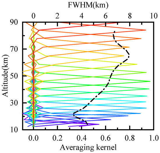 The vertical resolution of the HO retrieval was obtained from the full width at half maximum (FWHM) of the averaging kernels [29]. Figure 11 shows the averaging kernels and vertical resolution of HO retrieval for 60–65 S in January. The solid line is the averaging kernel at 12–85 km with different color representing different altitudes. The dashed line represents the vertical resolution. The vertical resolution of HO profiles was better than 5 km below 32 km, and about 5–8 km between 35 and 85 km.