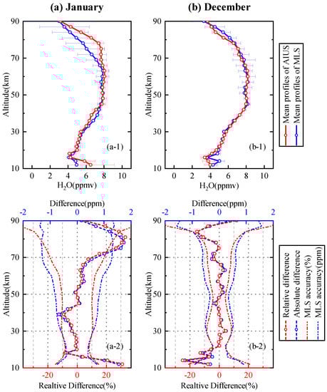 The comparison of HO profiles for 60–65 S in January and December is presented in Figure 12. Figure 12a-1 shows the mean profile of AIUS and MLS in January. The mean profile of AIUS was consistent with that of MLS in 16–72 km. The standard deviations of the AIUS profiles were within 0.6 ppm in 16–90 km. The standard deviations of AIUS profiles were mostly less than those of MLS. The relative and absolute differences of the mean profile between AIUS and MLS in January are presented in Figure 12a-2. The relative differences were within ±10% (about 0–0.67 ppm) between 16 km and 70 km, and 4–33% at 10–16 km and 70–90 km. The relative differences stayed within the acceptable range of MLS differences at 16–72 km and 84–90 km. Figure 12b-1 illustrates that the mean profile of AIUS had a good agreement with that of MLS in December. The standard deviations of AIUS profiles were within 0.4 ppm between 16 km and 90 km. Figure 12b-2 shows that the relative differences were mostly within ±5% (about 0–0.3 ppm) at 20–80 km, and 5–15% at 16–20 km and 80–90 km. The relative differences basically stayed within the acceptable range of MLS differences at 16–90 km.
