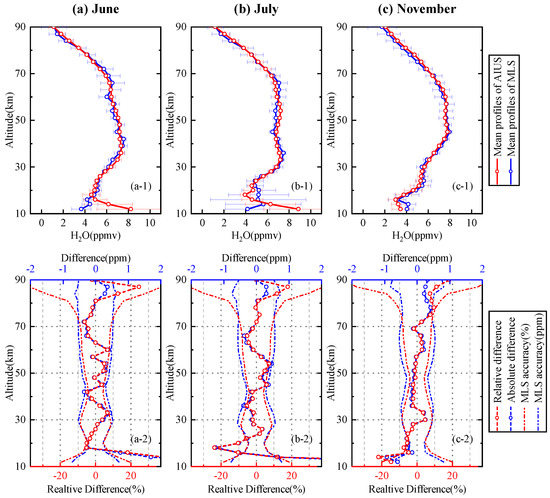The comparison of HO profiles for 65–70 S in June, July, and November are presented in Figure 13. Figure 13a-1 shows the mean profile of AIUS and MLS in June. The mean profile of AIUS agreed well with that of MLS. The standard deviations of AIUS profiles were within 0.5 ppm at 20–90 km. The relative and absolute differences of the mean profile in June are presented in Figure 13a-2. The relative differences were basically within ±7% (about 0–0.4 ppm) between 18 km and 81 km. Figure 13b-1 shows the mean profile of AIUS and MLS in July. The standard deviations of the AIUS profile were within 0.6 ppm at 18–90 km. Figure 13b-2 shows that the relative differences were basically within ±10% between 14 km and 84 km. Figure 13c-1 shows the mean profile of AIUS and MLS in November. Figure 13c-2 shows that the relative differences were less than 6% at 16–72 km and less than 10% at 72–84 km. The relative differences of the HO profile mostly stayed within the acceptable range of MLS differences above 16 km for 65–70 S. However, the relative differences were a little larger below 16 km. The relative differences of the HO profiles were the same as those shown in Figure 9, which indicates that the relative differences below 16 km were mainly caused by the large uncertainties of measurement at lower latitudes.