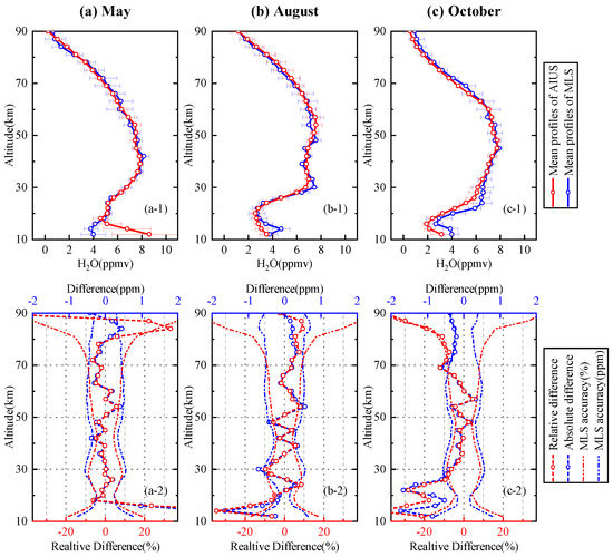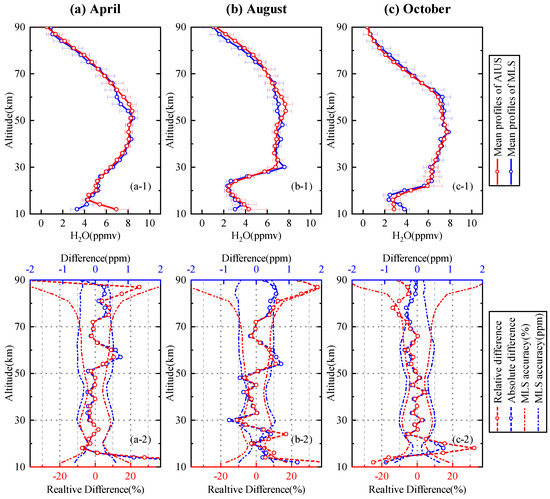 Figure 15 presents a comparison of the HO profiles for 75–80 S in April, August, and October. Figure 15a-1,b-1,c-1 illustrate that the mean profile of AIUS agreed well with that of MLS in all three months, which indicated that that the vertical distribution of the HO profile was captured well by AIUS measurements. The standard deviations of the AIUS HO profiles in August were slightly larger than the other two months. Figure 15a-2,b-2,c-2 show that the differences were within ±4.5% at 16–54 km and −2% to 11% at 54–81 km in April, ±10% at 14–78 km in August, ±6% at 22–72 km, and ±15% at 14–20 km in October. In general, the differences mostly stayed within the acceptable range of MLS differences at 16–90 km for 75–80 S.
