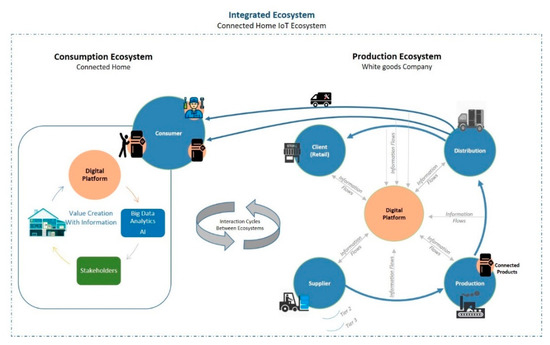 The second element is composed by the technological enablers, which the investigators view as a lever for business model innovation [12]; In this regard, several technological tendencies stand out; although, the common denominator in the different investigations could be summarized in two, the technologies related to advanced data analytics [13], and the artificial intelligence applied along the supply chain [14,15]. The new interrelations propelled by the digital technologies in the white goods industry could be analysed more optimally by differentiating between the production ecosystem and the consumption ecosystem. The production ecosystem consists in the interrelations that happen in a value chain, as the production and selling of a product or the post selling service. On the contrary, the consumption ecosystems consist in the interrelations that evolve after selling a product or offering a service digitally [16,17]. For better understanding, Figure 1 illustrates the integration of these two concepts.