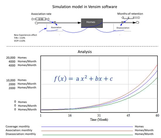 Inside the IoT ecosystem, the connection of homes to the new digital services grows dynamically over time. According to APPLIA (European association of home appliance manufacturers) the number of connected homes in Europe will grow 4X by 2024, compared to the 18 million reported in 2017 [22]. In this regard, there are different ways to calculate this connection and verify the shape of the curve that represents this growth. According to a simple dynamic simulation model (up to 60 months), which relates the number of connected homes by means of an association and disassociation rate; as shown in Figure 2, the curves of the new homes in the network and the disassociated homes are in constant growth. Thus, it is possible to infer that the number of users that are associated, will continue to be significantly bigger that of those who are disassociated. The network effect is created through ecosystem adoption, leading to value creation.