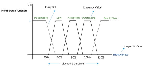 In line with the above, the change of membership function from one set to another is gradual and limited by the lack of well-defined boundaries between these sets. The following membership function has been defined to indicate the degree to which each element of the universe of discourse (Effectiveness = EF), belongs to a set. In other words, the membership function of a set FG (Fuzzy Groups) in a universe EF is of the form: , where if s is the degree to which EF belongs to FG. The membership function takes values in the interval [0, 1]. Figure 5, for example, shows how values lower than 70% have a high degree of membership in the unacceptable fuzzy set and values greater than 100% have a high degree of membership in the fuzzy best-in-class set.